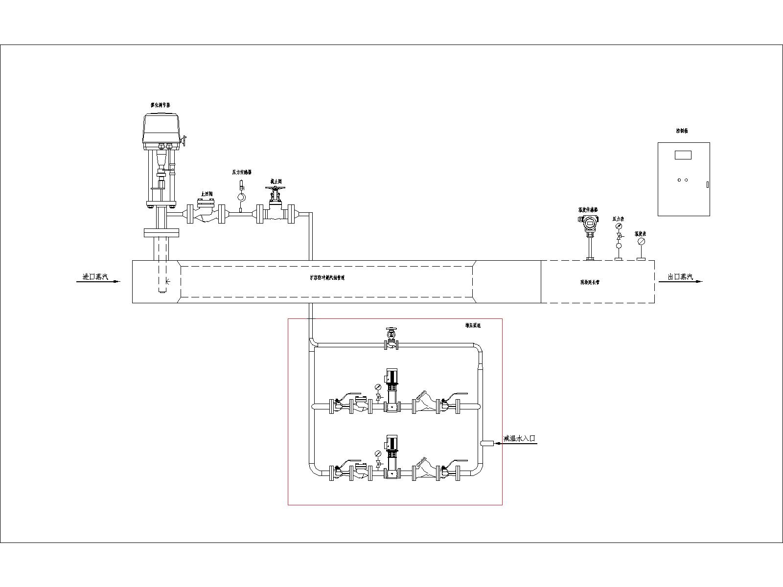增壓泵組是由增壓泵、截止閥、止回閥、過(guò)濾器、壓力表等固定框架撬裝組成,為減溫系統(tǒng)提供穩(wěn)定足夠的減溫水壓力和流量;